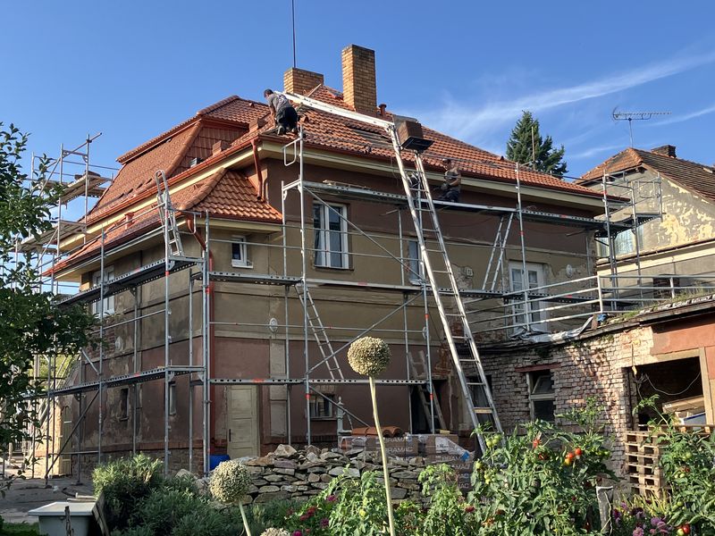 Když už je ve většině případů střecha pod difuzní folií, oplechovaná. Jsou hotové okapy a oplechování komínů, přichází na řadu položení střešní krytiny. Používáme jen časem ověřené krytiny, které mají pro svou kvalitu v Čechách dobré jméno a v případě potřeby i spolehlivý dealerský servis.
